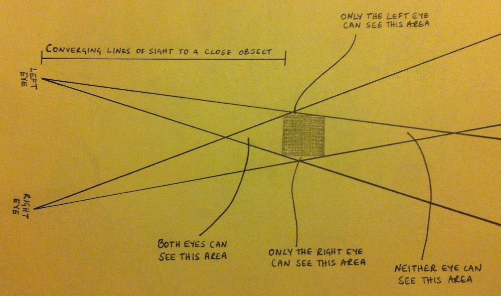 He began by observing that when you look at an object at a distance – the shed at the bottom of your garden, for example – it looks just the same whether you view it with both eyes or with only one. The two separate lines of sight between each eye and the distant object are, to all intents and purposes, parallel; each eye sees exactly the same image.