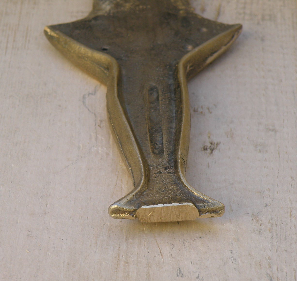 When I started to clean up the sword (see previous blog post) the first thing I did was to remove the pouring cup from the hilt and the little spur of bronze from the tip of the blade. During the casting the molten metal was poured, vertically, from the crucible into the pouring cup. When Neil Burridge made the sword mould he included a little channel continuing from the tip for about 2cm, to ensure that the molten metal ran all the way down to the bottom of the sword tip during the pour.